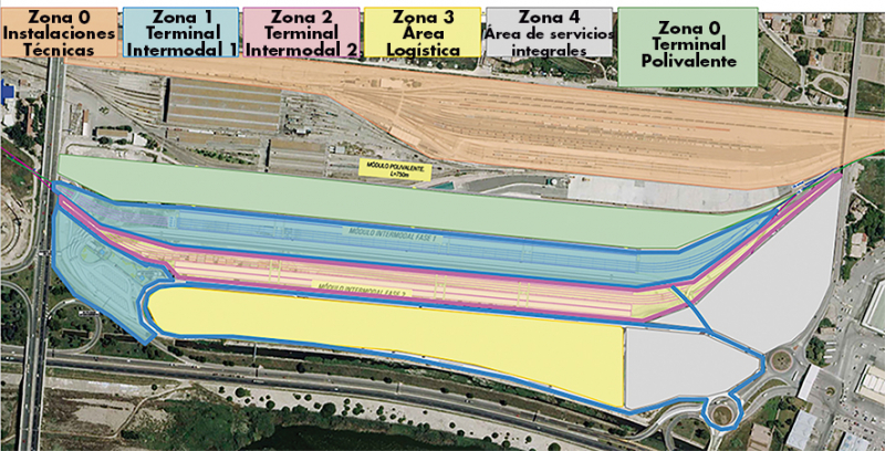 La zona amarilla se reservará a almacenes para actividades logísticas con posible acceso directo a los ferrocarriles. En la zona gris se instalarán servicios para vehículos y personas. Finalmente, en la zona verde estará la terminal ferroviaria y el depósito adicional de UTIs.