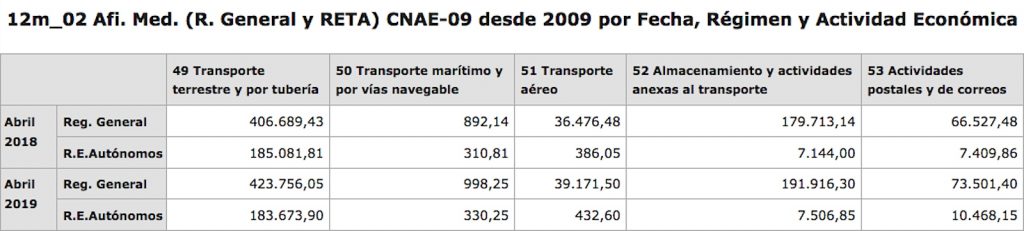 Por actividad, el transporte terrestre y por tubería ha experimentado un crecimiento del 2,65%, pasando de 591.771 afiliados en abril de 2018 a 607.430 este año. El crecimiento se ha dado entre los trabajadores dados de alta en el régimen general, ya que el número de autónomos en este tipo de empleos ha descendido en casi 1.500 afiliados.
