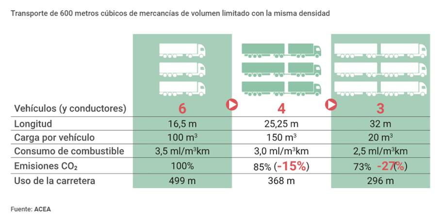 La asociación de fabricantes europeos del sector del automóvil ha asegurado que “la experiencia muestra que los vehículos de alta capacidad son más eficientes y productivos que los vehículos pesados estándar, ya que pueden consolidar mercancías de camiones más pequeños, consumen menos combustible y producen menos emisiones». Según su último informe, un megatruck tiene capacidad para reemplazar hasta seis camiones estándar.