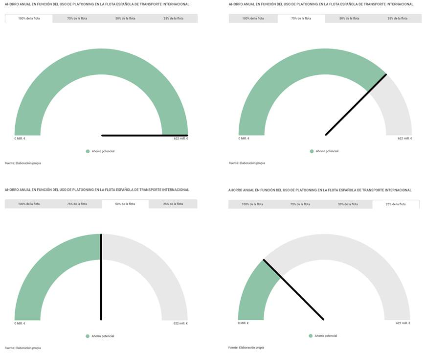 Sin embargo, resulta poco realista pensar que el 100% de la flota española de transporte internacional pueda utilizar el platooning en sus operaciones, según han reconocido algunas fuentes a esta publicación. En el peor de los casos analizados, que sería su utilización por el 25% de los camiones españoles autorizados para transporte internacional de mercancías por carretera en la Unión Europea, la reducción de costes ascendería a 155 millones de euros al año.