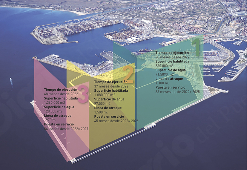 La primera fase, que entrará en servicio 36 meses después de la entrega de la obra, contempla la habilitación de 860.000 metros cuadrados de superficie, 71.500 metros de lámina de agua y 1.100 metros de línea de atraque. Pasados nueve meses, la concesión se ampliará hasta 1.080.000 metros cuadrados de superficie, 97.500 metros de lámina de agua y 1.500 de línea de atraque.
