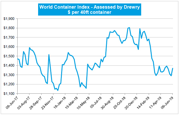 El Índice Mundial de Contenedores elaborado por la consultora Drewry, que evalúa las tasas de carga de contenedores en las ocho rutas principales hacia y desde Estados Unidos, Europa y Asia, abre el mes de junio con un incremento del 6,2% respecto a la última semana de mayo, situándose en 1.370,93 $/FEU. Sin embargo, el índice descendió un 3.9% en comparación con el mismo período de 2018.