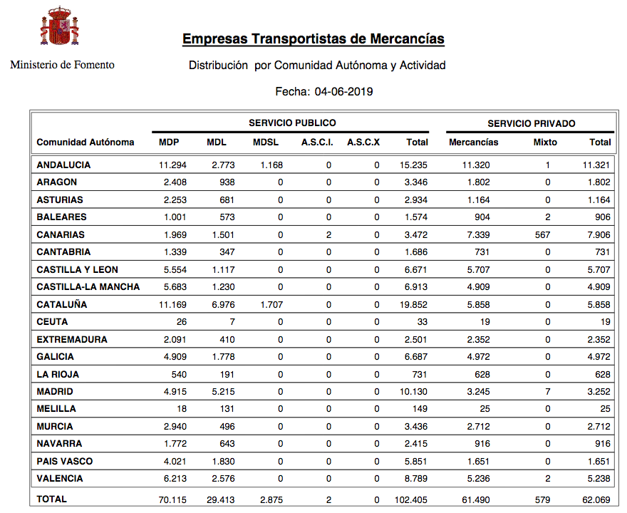 La Comunidad Autónoma que más empresas de transporte de mercancías registra en mayo de 2019 es Andalucía en el sector público (15.235) y en el sector privado (11.320), que contabiliza en total 26.555 empresas.