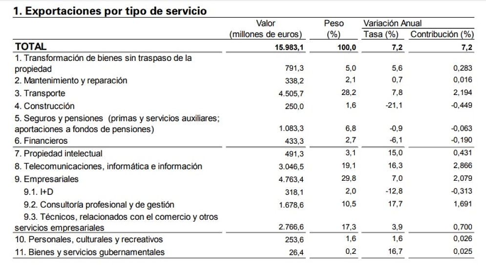 De esta forma, el sector del servicio de transporte es el segundo que más aporta a las exportaciones, siendo responsable del 28,2% del valor total de la exportación de servicios española. Al mismo tiempo, es el quinto sector que más contribuye en las importaciones, por detrás del sector empresarial, la propiedad intelectual, los seguros y pensiones y las telecomunicaciones.