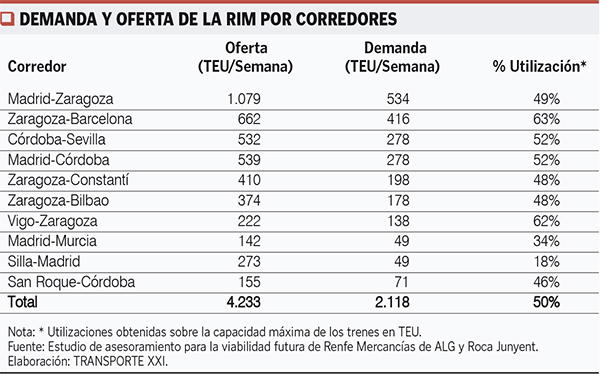El estudio confirma que la RIM está constituida en gran medida por relaciones de pequeño y mediano volumen. En concreto, tan solo dos relaciones superan los 150 TEUs semanales. Se trata de la Madrid-Barcelona, que sumó una demanda de 222 TEUs semanales entre el 1 de noviembre de 2018 al 13 de enero de 2019; y Madrid-Sevilla, que alcanzó una demanda de 177 TEUs semanales en este mismo período.