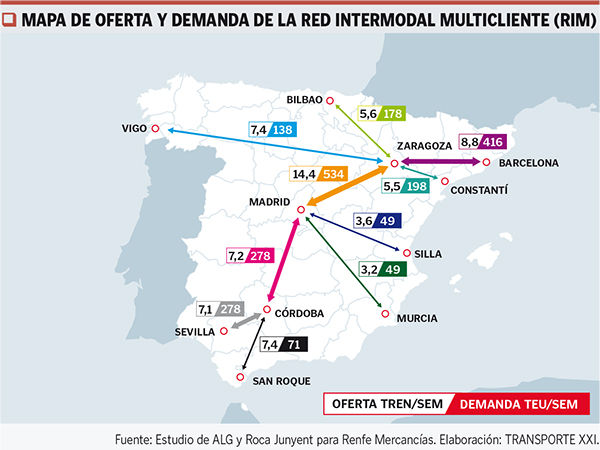 El informe asegura que el servicio intermodal multicliente de Renfe Mercancías transporta una media de 2.118 TEUs a la semana, equivalente a 0,8 millones de TEUs por kilómetro, a través de 25 relaciones origen y destino repartidas entre una decena de corredores.