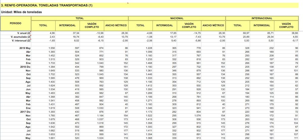 La operadora Renfe Mercancías transportó en mayo de 2019 un total de 1.556.000 toneladas de mercancías. Poniendo en comparación esta cifra con la registrada en abril de 2018, ésta supone un aumento de 4.96%. Además, los cinco primeros meses del año se ha movido 2,43% más que en los cinco meses del año pasado.