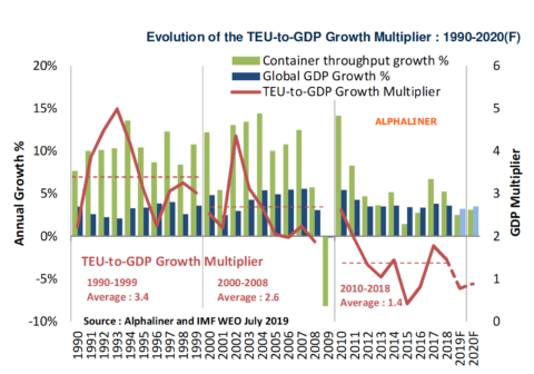 A pesar del aumento de las tensiones entre Estados Unidos y China, los volúmenes del transporte marítimo de contenedores continúan creciendo en 2019. Las últimas predicciones de Alphaliner muestran un incremento del 2,5% en 2019, aunque la cifra está por debajo del 3,5% previsto en el mes de enero.