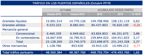 De igual modo, el movimiento de mercancía general en el mes ha sumado un volumen total de 23.740.575 toneladas, un 2,65% más que en el décimo mes de 2018.
