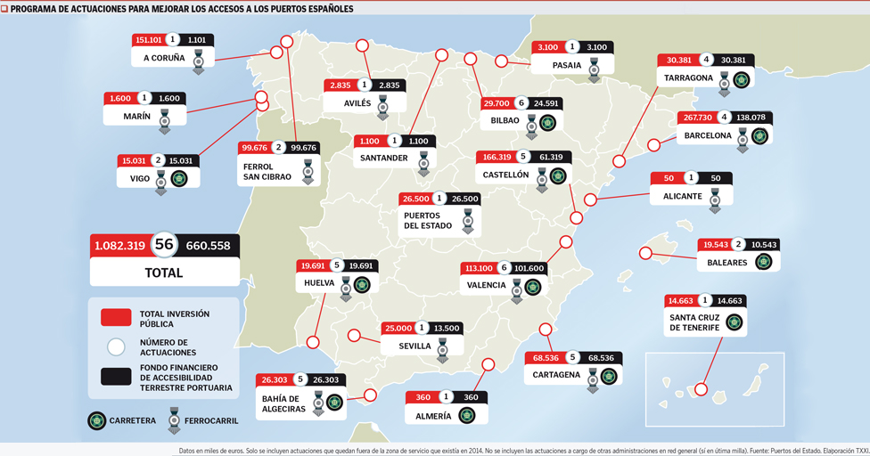 Hasta la fecha, el desembolso realizado por el sistema portuario español alcanza los 137 millones de euros, a los que habrá que sumar la inyección de 116 millones prevista para el año 2020, según recoge el mismo documento. “La inversión empieza ahora a coger velocidad, ya que las diferentes actuaciones contempladas en el Fondo de Accesibilidad Terrestre Portuaria empiezan a ver la luz, según van superando los correspondientes estudios y trámites administrativos”, apuntaron a este periódico responsables del Ministerio de Fomento.