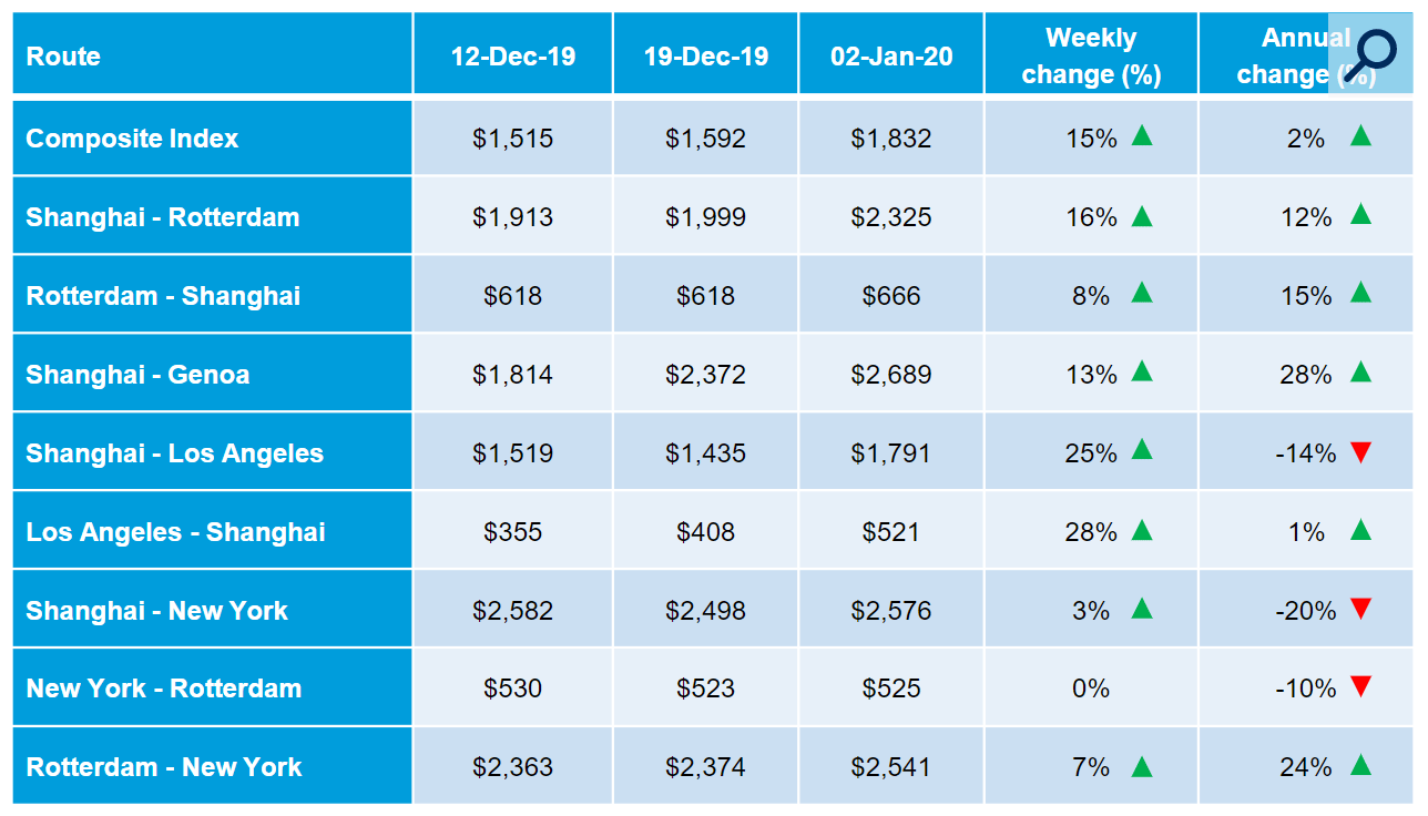 El índice Mundial de Contenedores (WCI) elaborado por la consultora Drewry, que evalúa las tasas de carga de contenedores en las ocho rutas principales hacia y desde Estados Unidos, Europa y Asia, se ha disparado esta semana un 15,1%, alcanzando los 1.832,23 dólares, 240 dólares más por contenedor de 40 pies. Este incremento es del 2,2 % en comparación con el mismo período de 2019. Las mayores ganancias se registraron en el comercio Transpacífico.