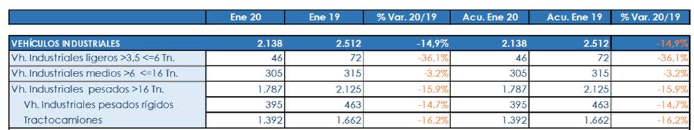 - Los vehículos industriales, autobuses, autocares y microbuses cierran el mes de enero con una caída de las ventas del 13,3%.