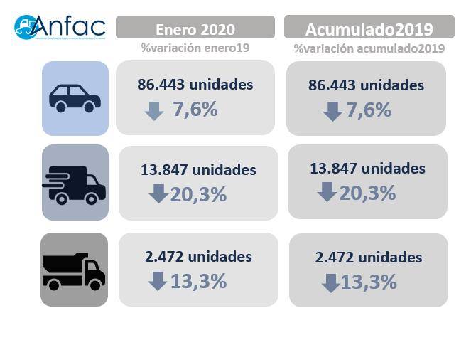 Todos los segmentos de venta de vehículos redujeron sus ventas en el mes de enero respecto del mismo mes del año anterior. Las matriculaciones de turismos y todoterrenos en enero se quedaron en 86.443 unidades, un 7,6% menos que en el mismo mes del año anterior, con un día laborable menos en 2020. De hecho, la caída es más aguzada si se tiene en cuenta que se compara con un mes de enero de 2019 en el que ya descendían las entregas. De este modo, se rompe con la tendencia de cuatro meses de crecimiento registrado en el último periodo de 2019, que, pese a este último cuatrimestre en positivo, cerró el año completo con una reducción de las ventas del 4,8%.
