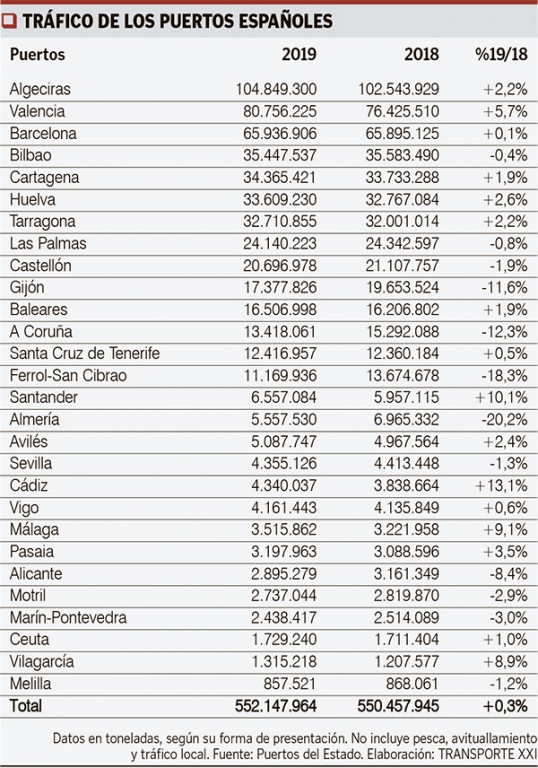 Tras las fuertes caídas en los dos últimos meses de 2019, un 6,4 por ciento en noviembre y un 7,6 por ciento en diciembre, las 28 autoridades portuarias, que gestionan 46 puertos de interés general, completaron el pasado año con un ligero avance del 0,3 por ciento, hasta superar los 552 millones de toneladas, un nuevo máximo histórico (ver cuadro adjunto). Un movimiento que se eleva hasta los 564,6 millones de toneladas, incluyendo pesca, avituallamiento y tráfico interior (+0,2 por ciento).