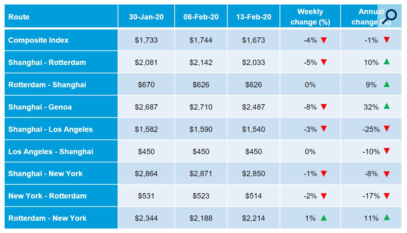 Las tasas de flete en las operaciones con origen en Asia experimentaron una disminución debido al brote de coronavirus en China. En relación las diferentes rutas, la evolución es la siguiente: