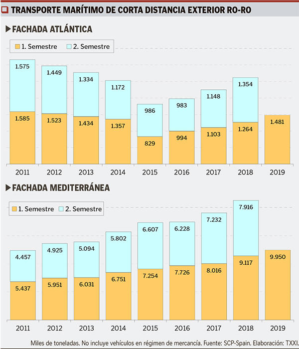 El transporte marítimo internacional ro-ro de corta distancia (excluidos los vehículos nuevos como mercancías) sumó 1,48 millones de toneladas, hasta junio, lo que supone un crecimiento del 17,5 por ciento en comparación con el mismo periodo de 2018. Haciendo una extrapolación de esta evolución, el short sea shipping ha rondado los tres millones de toneladas en los puertos atlánticos en 2019. Hay que retroceder a los años 2010 y 2011 para un volumen de actividad superior a tres millones de toneladas o rondándolos (2012).