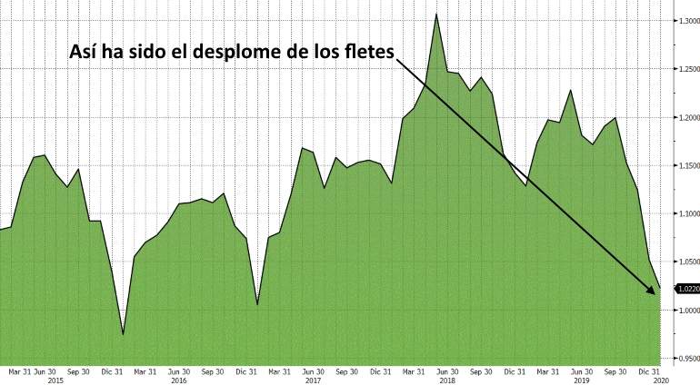 El dato para este mismo índice analizado desde el gasto total en fletes (en lugar del volumen) ha sido también malo en enero, con un retroceso del 8%, pero aún lejos del peor de todos, que presentó un desplome del 29,4%también del mes de junio de 2009, explica el economista español Crespo señala que «la situación en el mercado de fletes de EEUU ha seguido deteriorándose en enero y, presumiblemente, con los problemas sanitarios en China y el parón del comercio que habrá supuesto, habrá seguido cayendo durante el presente mes de febrero».