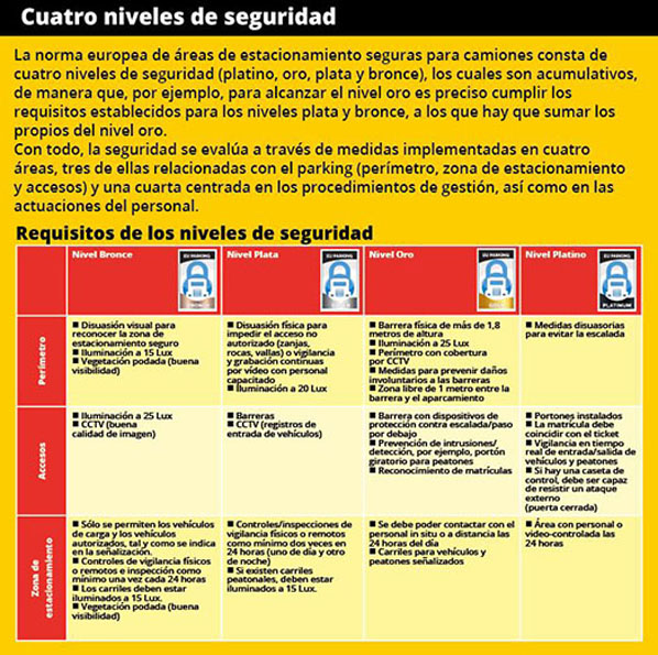 La norma europea de áreas de estacionamiento seguras para camiones consta de cuatro niveles de seguridad (platino, oro, plata y bronce), los cuales son acumulativos, de manera que, por ejemplo, para alcanzar el nivel oro es preciso cumplir los requisitos establecidos para los niveles plata y bronce, a los que hay que sumar los propios del nivel oro.