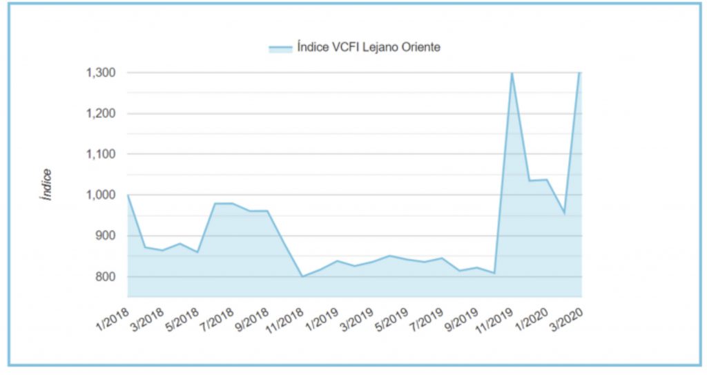 En el caso específico de Lejano Oriente, la tasa de crecimiento en el mes de marzo alcanza el 42,42%, lo que constituye la segunda mayor subida de la serie tras la acontecida en noviembre de 2019, situando al índice en un valor de 1.362,83 puntos. Como ya se ha expuesto, el brote de coronavirus en China y las medidas de contención adoptadas para frenar su expansión, ha provocado una desaceleración de la actividad en China. Esto ha derivado en una fuerte reducción de la capacidad ofertada por el aumento de cancelaciones, lo que sumado a la situación de congestión que se dio en los primeros momentos de la crisis en ciertos puertos chinos, ha tensionado fuertemente la ruta, traduciéndose en un fuerte incremento de los fletes.