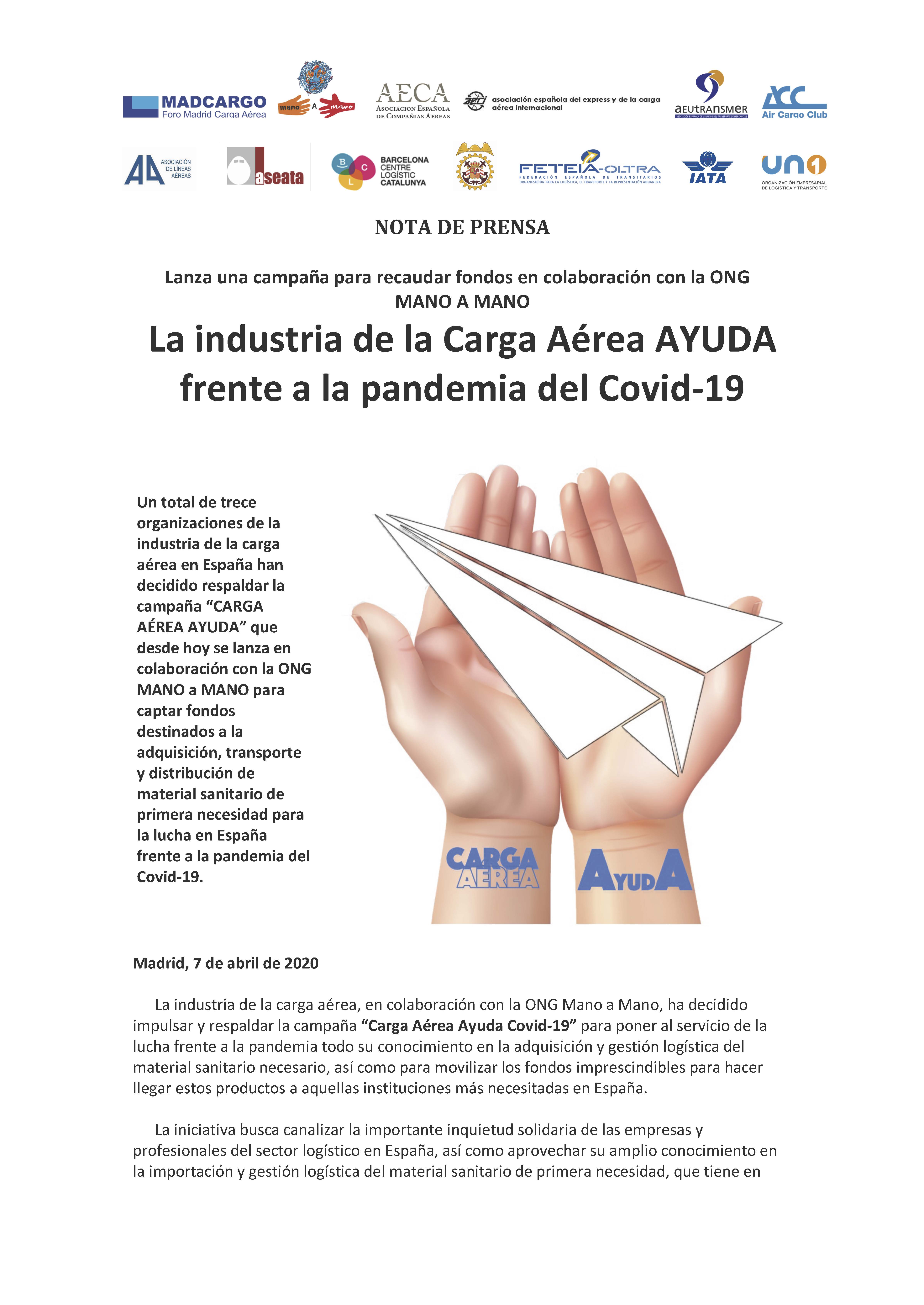 07/04/2020 Aeutransmer se ha unido a otras doce organizaciones de la industria de la carga aérea en España para respaldar la campaña “CARGA AÉREA AYUDA” que desde hoy lanzamos en colaboración con la ONG MANO a MANO, con el objetivo de captar fondos destinados a la adquisición, transporte y distribución de material sanitario de primera necesidad para la lucha en España frente a la pandemia del Covid-19.