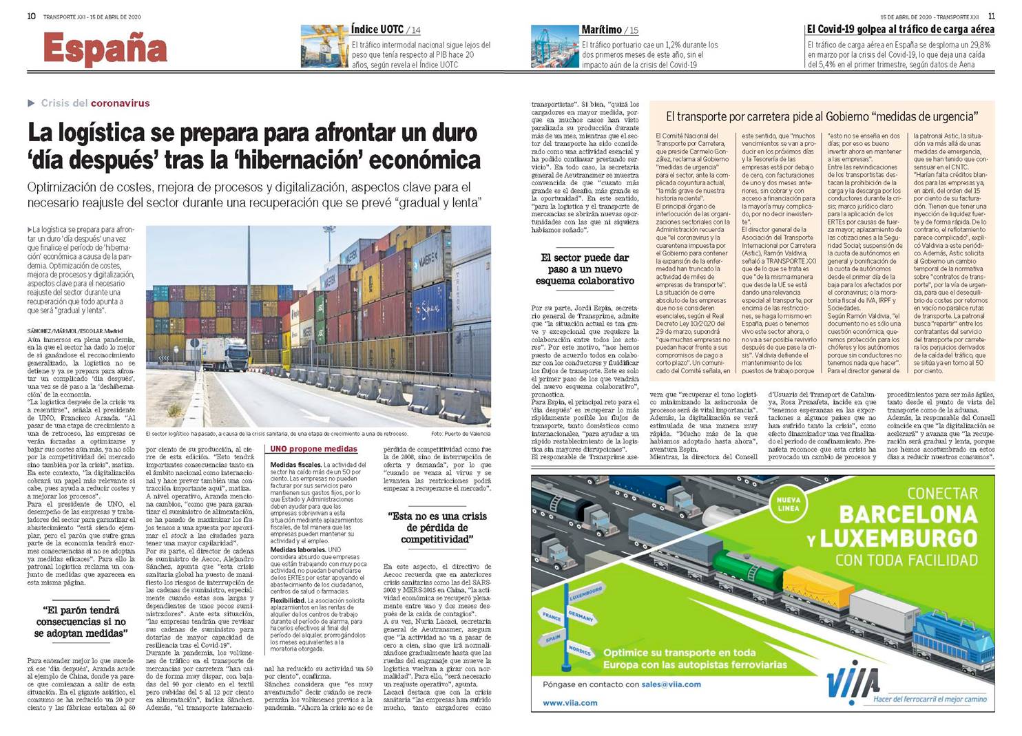 Para el presidente de UNO, el desempeño de las empresas y trabajadores del sector para garantizar el abastecimiento “está siendo ejemplar, pero el parón que sufre gran parte de la economía tendrá enormes consecuencias si no se adoptan ya medidas eficaces”. Para ello la patronal logística reclama un conjunto de medidas que aparecen en esta misma página.