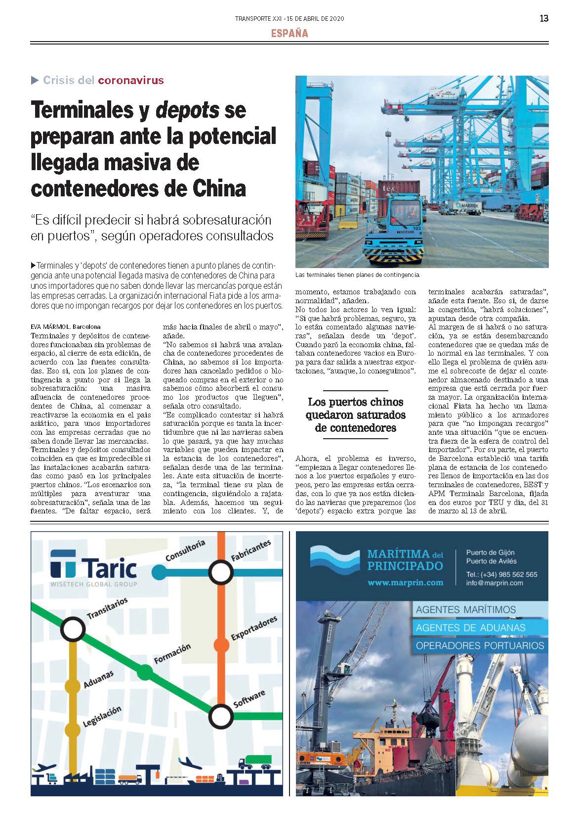 Terminales y depósitos de contenedores funcionaban sin problemas de espacio, al cierre de esta edición, de acuerdo con las fuentes consultadas. Eso sí, con los planes de contingencia a punto por si llega la sobresaturación: una masiva afluencia de contenedores procedentes de China, al comenzar a reactivarse la economía en el país asiático, para unos importadores que se pueden encontrar con empresas cerradas donde llevar las mercancías.