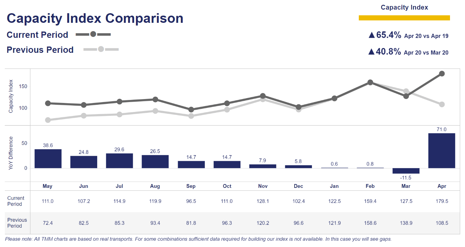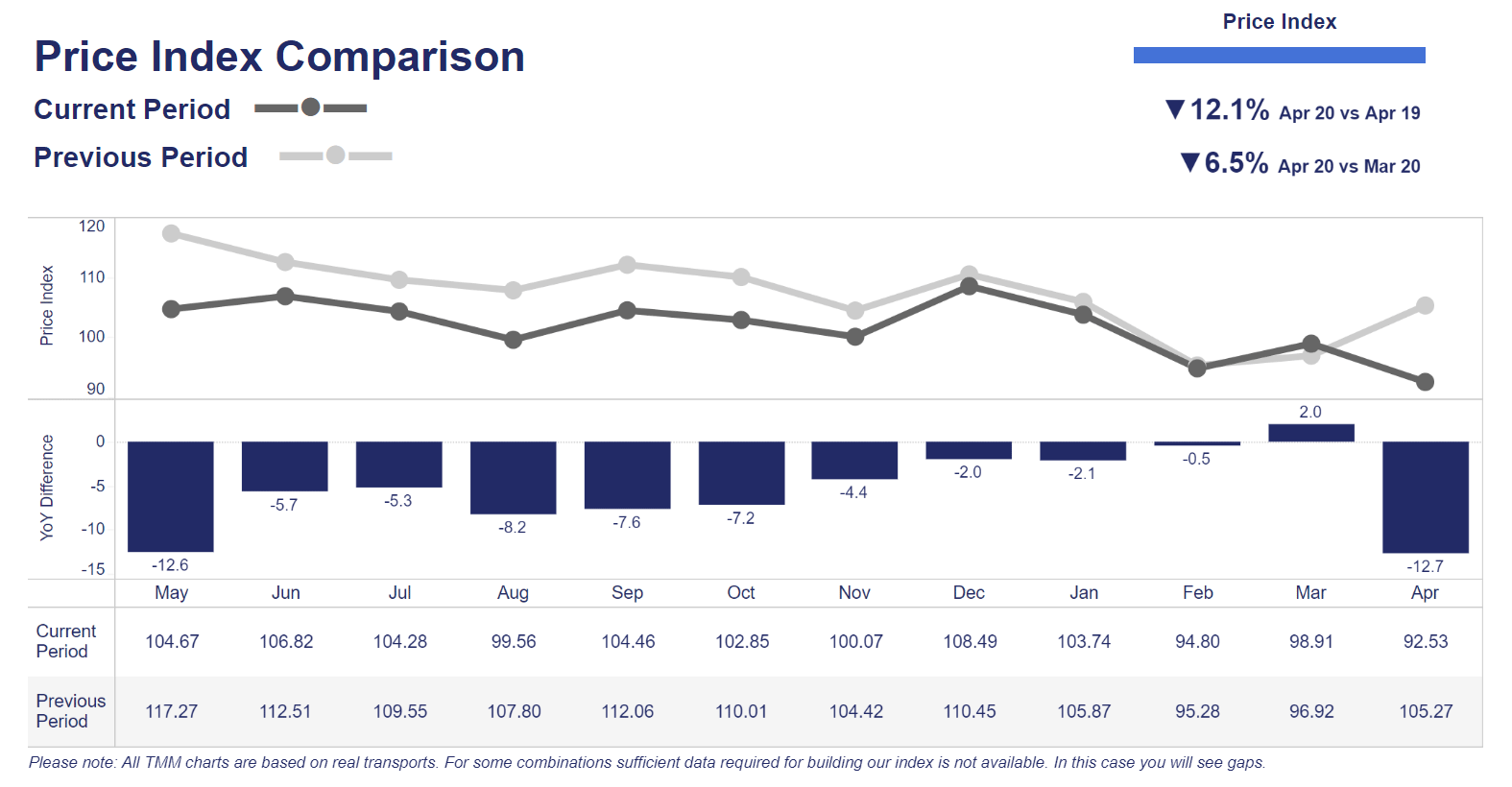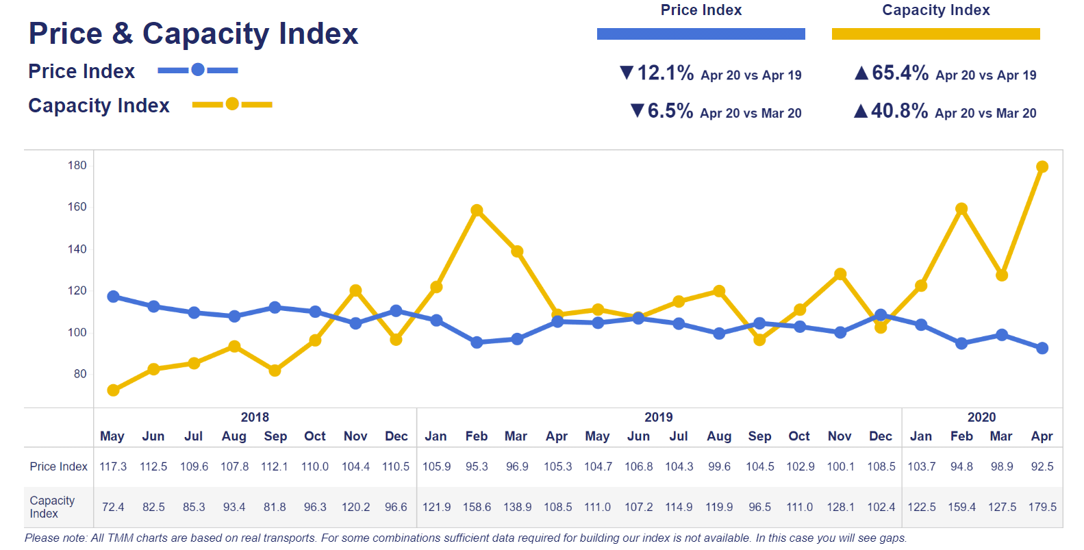 Según refleja el Transport Market Monitor elaborado por Transporeon, el precio del transporte en Europa descendió en abril un 12,1 % en comparación con el mismo mes de 2019, mientras que la capacidad de carga aumentó en un 65,4%. En comparación con el mes anterior, la tónica es similar, el índice de precios disminuyó un 6,5% y la capacidad aumentó un 40,8%.