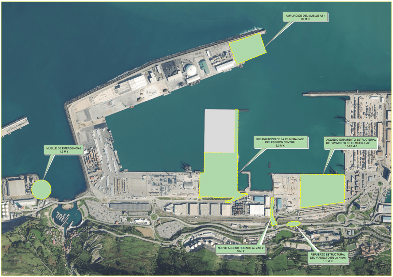 Además está en fase de redacción el proyecto de acondicionamiento estructural de pavimento en el muelle A2, por un importe (a falta de completar el proyecto) de entre 15 y 20 millones de euros y además, se licitarán a lo largo de 2020 otras obras de menor cuantía, como son un muelle de Emergencias (1,2 millones de euros), refuerzo estructural de viaducto en la N644 (1,1 millones de euros) y otra serie amplia de obras menores.