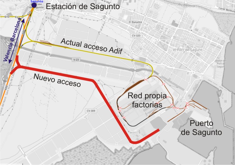 Adif ha adjudicado a Obras y Servicios, Copasa, las obras del nuevo acceso ferroviario de mercancías al puerto de Sagunto, en Valencia, y las mejoras en su conexión con el Corredor Mediterráneo y el Corredor Cantábrico-Mediterráneo. La actuación comprende la ejecución de tres ramales diferenciados, en un total de 5,6 kilómetros, que confluyen y garantizan el acceso al puerto de los trenes de mercancías que provienen de Valencia y Castellón.