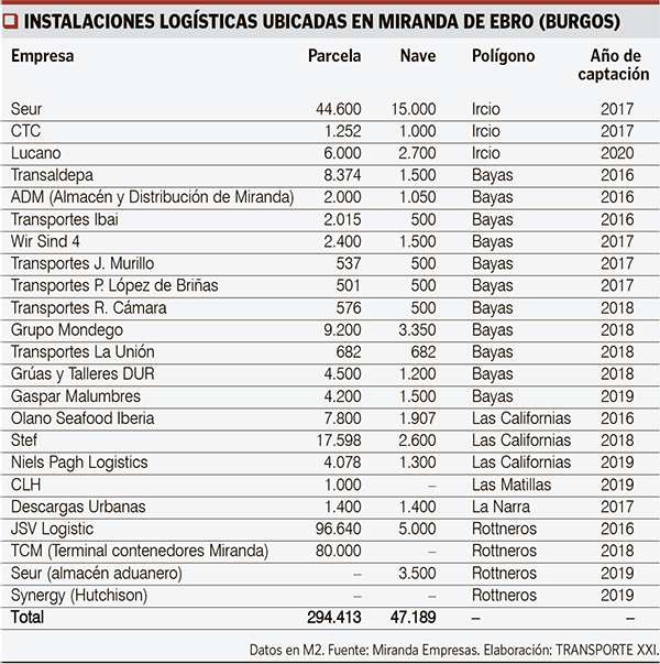 En la actualidad, Miranda de Ebro cuenta con 23 empresas implantadas que desarrollan actividades logísticas, de las que 18 ya han entrado en funcionamiento y otras cinco lo harán cuando culminen la construcción de sus nuevas naves. Estas cinco empresas son Seur, con una segunda nave en el poligono de Ircio, Stef, Niels Pagh Logistics, CTC y Lucano.