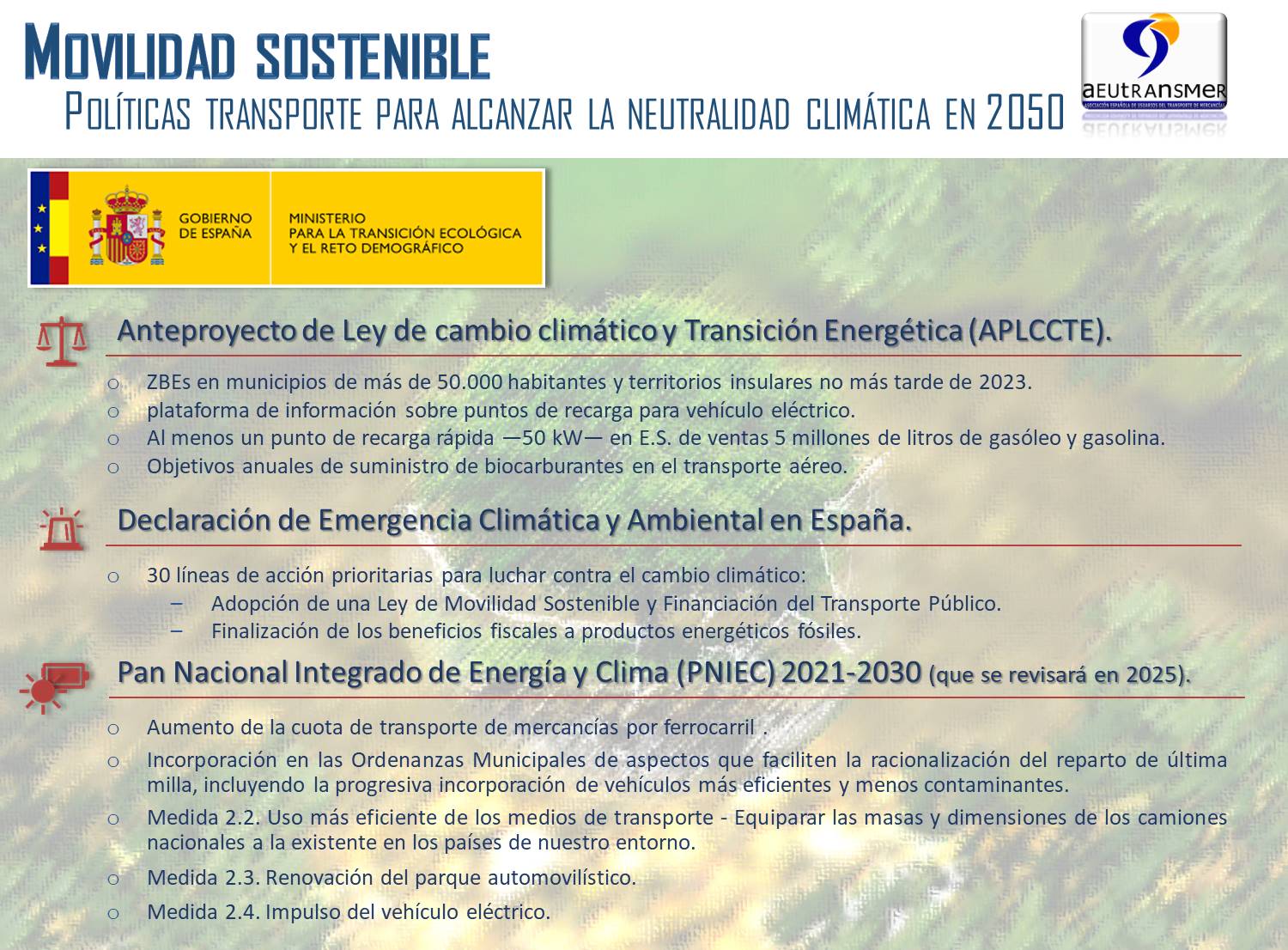 Los objetivos planteados en la ley se consiguen a través de un conjunto de medidas que se incorporan al texto, y otras que se plasman en el Plan Nacional Integrado de Energía y Clima (PNIEC).
