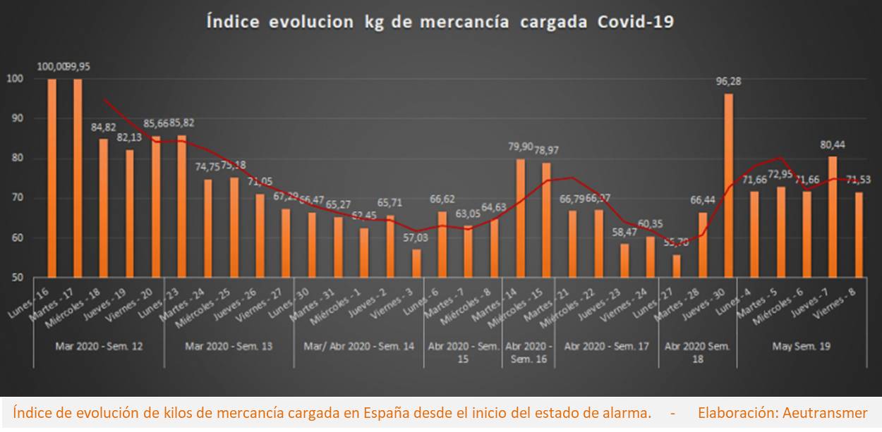 A petición del Ministerio de Transportes, Movilidad y Agenda Urbana, la asociación de cargadores ha recopilado desde que comenzó el estado de alarma información sobre los kilos de mercancía cargada en base a una muestra seleccionada de entre sus empresas asociadas.
