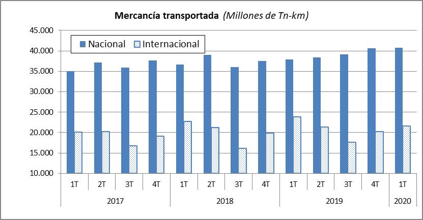 Según recoge la última encuesta permanente del transporte de mercancías por carretera que elabora el Ministerio de Fomento, en el primer trimestre de 2020 se han transportado 62.326 millones de toneladas-kilómetro en el servicio público, un 1,07% más que el mismo periodo de 2019 (61.881 millones de toneladas).
