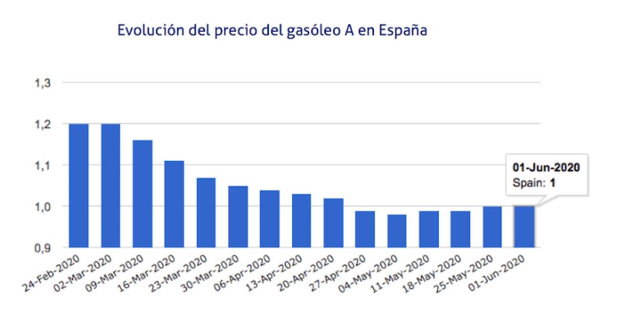 Entre los días 26 de mayo  y 1 de junio de 2020, el precio del gasóleo se ha situado en los 1,001 euros, lo que supone un incremento del 1,21% respecto a los 0,997 euros del registro anterior y marca su tercera semana al alza. Además, se encuentra un 19,72% por debajo de los 1,247 euros de la primera semana del año.