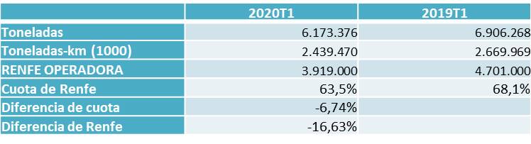 Durante el primer trimestre del año las toneladas transportadas ha disminuido un 10,61% en comparación del primer trimestre del año 2019, Así como también ha disminuido la toneladas-kilometro en un 49,75 en comparación del mismo periodo. Rente Mercancías ha tenido una disminución del 16,63%, bajando un 6,74% la cuota.