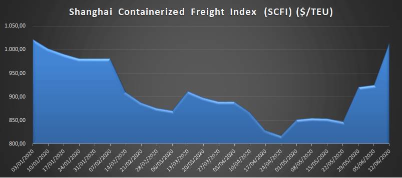 El SFCI ha experimentado esta semana la mayor subida en lo que va de año, (9,71%), situando el índice en 1.015,33 $/TEU, frente a los 925,50 $/TEU del viernes anterior.