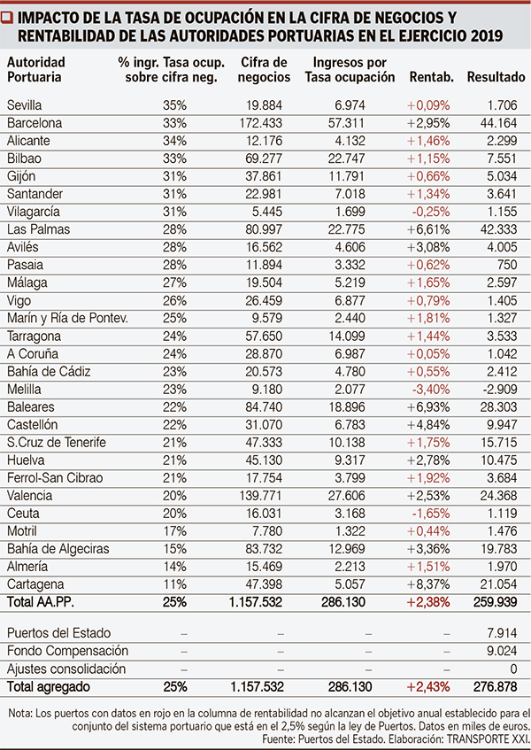 Los puertos españoles, que tuvieron un índice de rentabilidad del 2,38 por ciento en 2019 inferior al exigido por ley, recaudaron un total de 286 millones de euros por la tasa de ocupación. Esto supone 25 de cada 100 euros que recaudan las Autoridades Portuarias, una cifra de negocio que superó los 1.157 millones de euros en 2019 con unos beneficios netos de 276 millones de euros (ver cuadro).