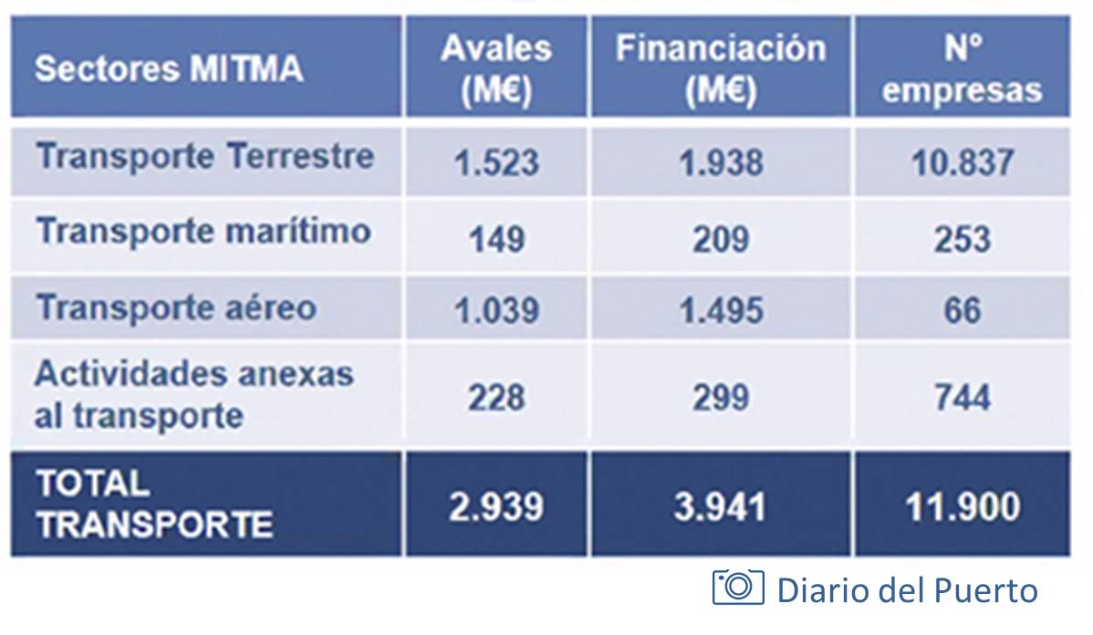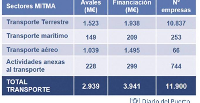 Por modos, 1.523 millones de euros de la línea de avales ICO están destinados a empresas de transporte terrestre (10.837 empresas); 149 millones de euros a empresas de transporte marítimo (253 empresas); 1.039 millones de euros a empresas de transporte aéreo (66 empresas); y 228 millones de euros serán destinados a empresas logísticas y/o de almacenamiento (744 empresas).