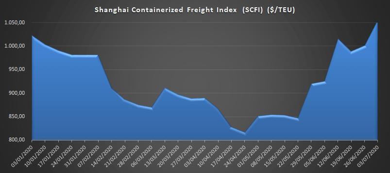 El SFCI ha experimentado esta semana una nueva subida, del 5,37%, situando el índice en 1.055,13 $/TEU, frente a los 1001,33 $/TEU del viernes anterior.