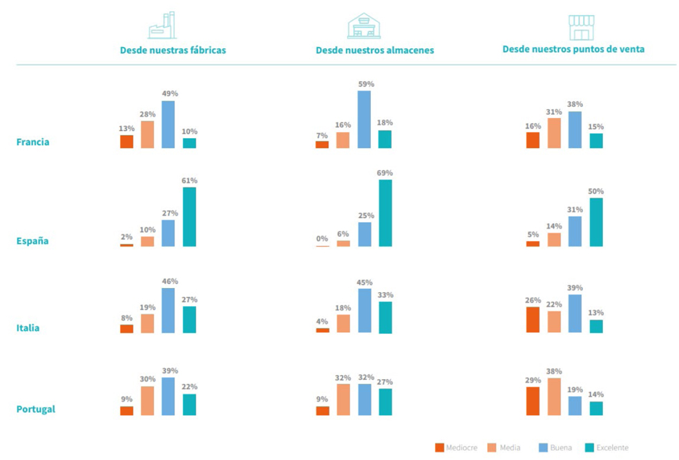 España es el país con la información más fiable sobre las acciones. Las empresas de allí dicen tener acceso a un excelente nivel de información, ya sea en almacenes (69%), fábricas (61%) o puntos de venta (50%).