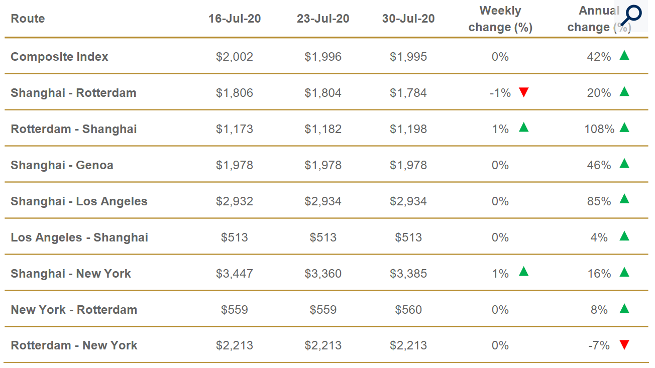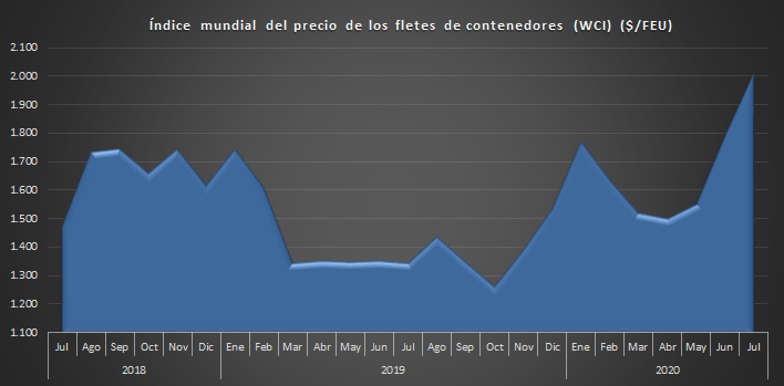 El índice elaborado por la consultora Drewry (WCI), que evalúa las tasas de carga de contenedores en las ocho rutas principales hacia y desde Estados Unidos, Europa y Asia, se ha situado esta semana en 1.994,68 dólares por contenedor de 40 pies, un 0,05% menos que la semana anterior pero un casi un 42% más respecto al mismo periodo de 2019.