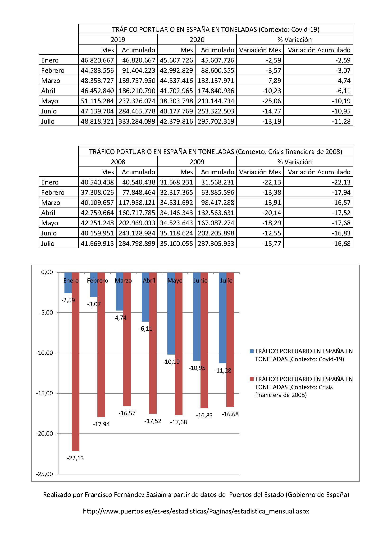 Comparativa del tráfico portuario en España tras la crisis financiera del 2008 con la era Covid-19, en términos de variación interanual acumulada.