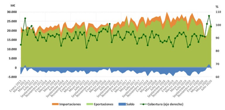 Como resultado, el déficit comercial de los siete primeros meses de 2020 alcanzó los 7.880 millones, dato que es un 54,2% inferior al registrado en el mismo período de 2019.