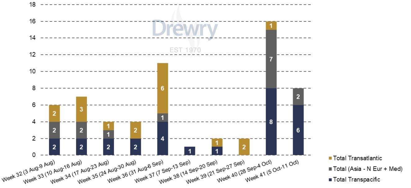En total, las líneas navieras han dejado 24 viajes en blanco para las dos siguientes semanas que sigan al 28 de septiembre, según un informe de Drewry.