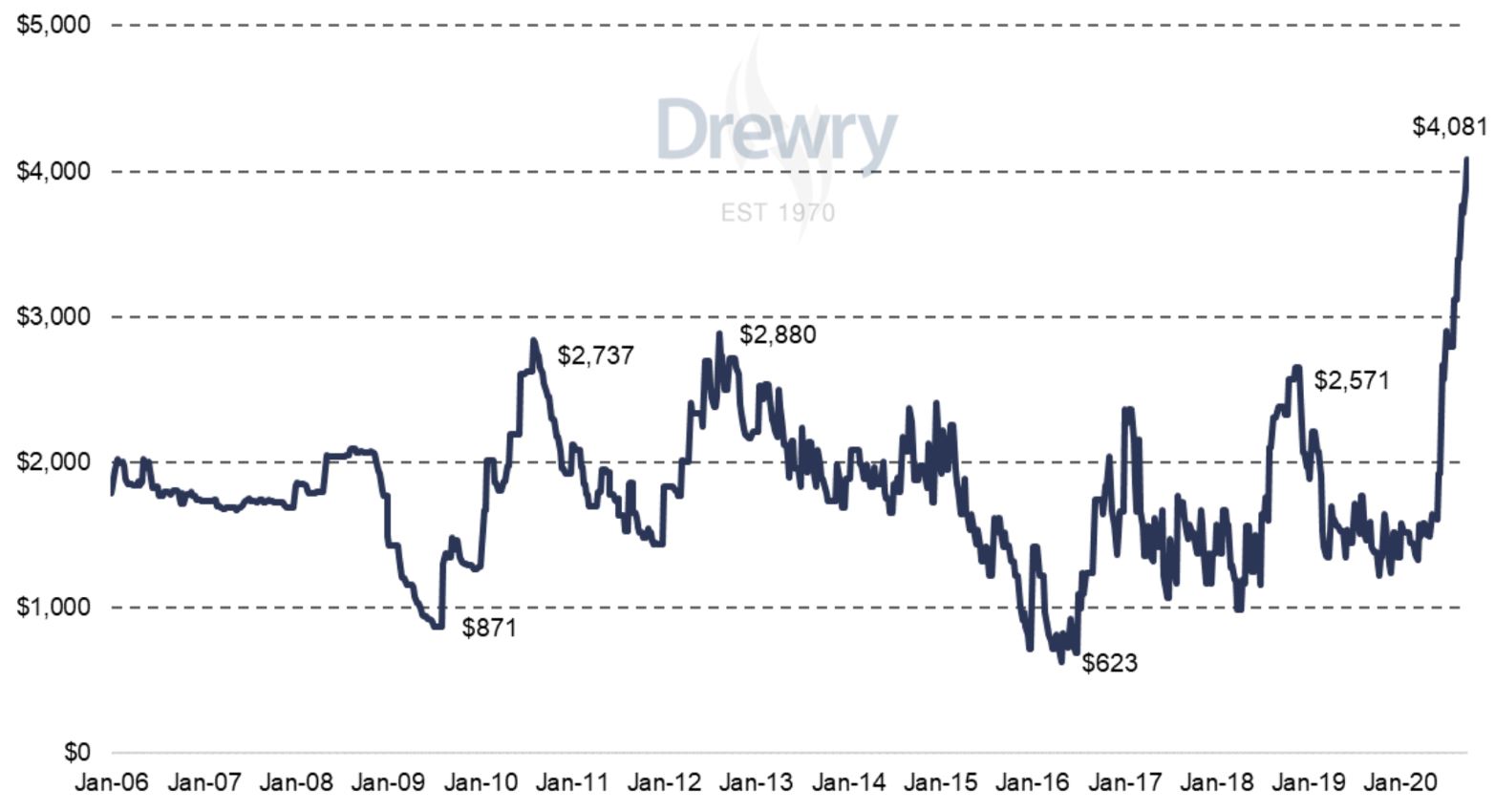 Como consultor independiente, experto en gestión de ofertas y proveedor de información sobre el mercado durante muchos años, Drewry cree que lo que estamos presenciando va más allá de la dinámica habitual de la oferta y la demanda del mercado en el trabajo. Es cierto que los envíos de contenedores asiáticos a los EE.UU. son actualmente muy fuertes, los cargadores están reponiendo sus inventarios, hay escasez de cajas vacías en China y los transportistas han eliminado parte de la capacidad de envío a través de viajes cancelados. Pero el mayor nivel de concentración en la industria de los transportistas marítimos, combinado con una nueva disciplina de gestión de capacidad más estricta entre los transportistas, también están detrás de estos niveles excepcionales de tarifas de flete. Los transportistas marítimos parecen haberse dado cuenta de la oportunidad que presenta la crisis del COVID-19 y que al administrar la capacidad de cerca, pueden administrar los precios con potencia.