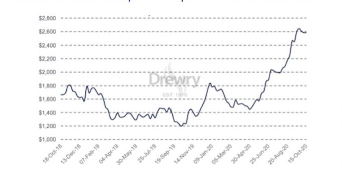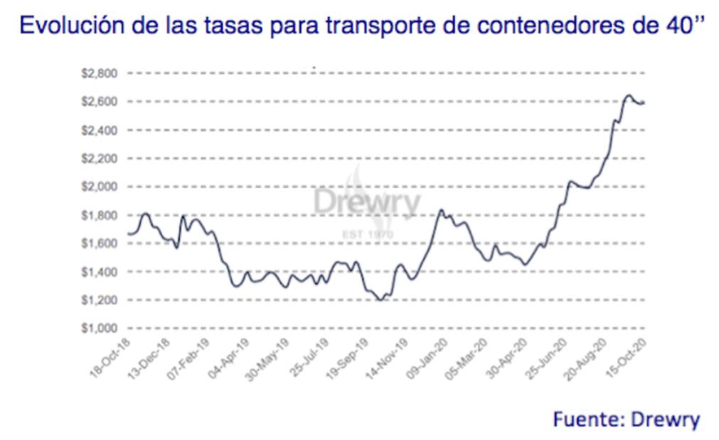 El Índice Mundial de Contenedores elaborado por la consultora Drewry, que evalúa las tasas de carga de contenedores en las ocho rutas principales hacia y desde Estados Unidos, Europa y Asia, se ha incrementado un 0,1% en la segunda semana de octubre, llegando hasta los 2.587 dólares (2.210 euros).