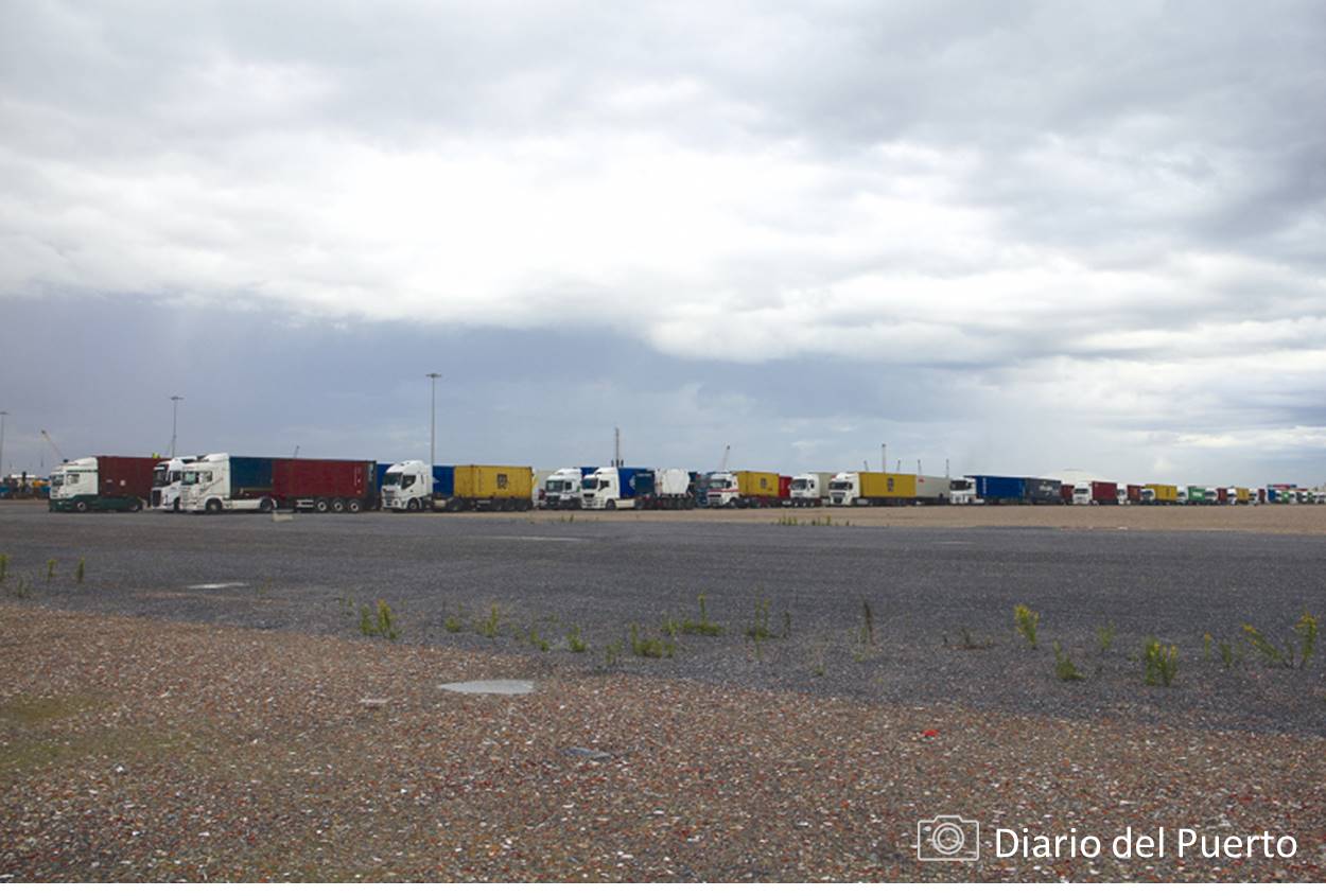 Las largas colas de camiones se repartían entre el acceso a la terminal de CSP Iberian Bilbao Terminal y la vasta superficie ganada al mar con la construcción del Espigón Central, a unos dos kilómetros de distancia, donde centenares de camiones aguardaban el momento para iniciar su aproximación a la terminal de contenedores.