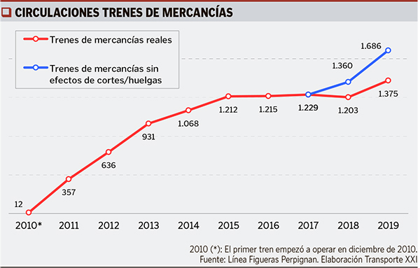 Es verdad que la línea ha multiplicado por cuatro sus tráficos en estos años. Y también es verdad, diez años después, que pasan cuatro veces más convoyes por la tradicional terminal gerundense de Portbou, haciendo el trasvase del ancho ibérico al internacional, que por la conexión en UIC sin ruptura de carga por el túnel de El Pertús.