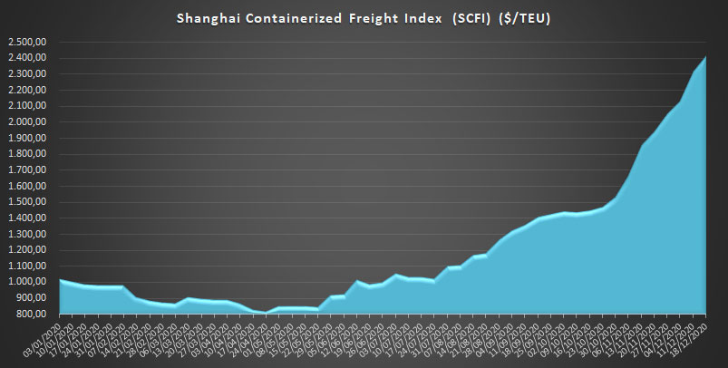 Los fletes llevan meses de subidas continuadas. Esta semana, el Shanghái Containerized Freight Index (SCFI) refleja un incremento del 166% respecto a los valores correspondientes al mismo periodo de 2019. Traer un contenedor desde Shanghái cuesta hoy 2.411,82 $/TEU, un 4,33% más que la semana anterior.