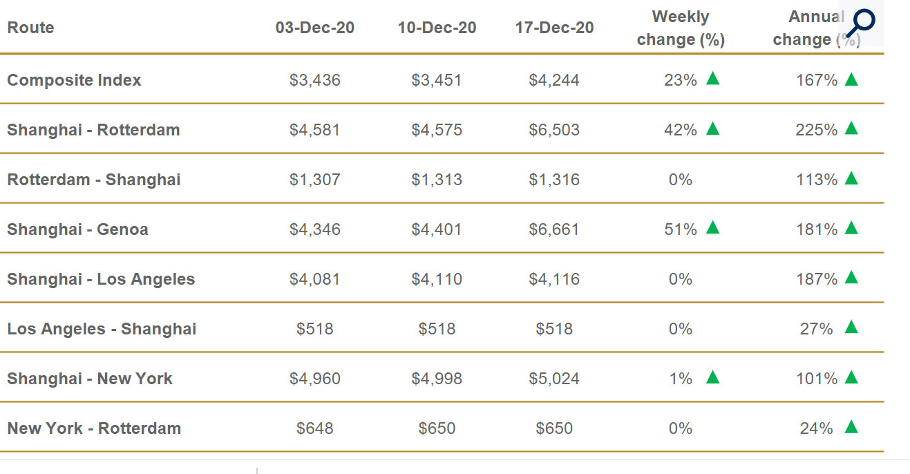 Por su parte, El World Container Index (WCI), que evalúa el coste de los fletes en la principales rutas hacia y desde Estados Unidos, se sitúa esta semana en $ 4.244,05 para un contenedor de 40 pies, lo que supone un aumento del 23% con respecto a la semana anterior y del 166,6% en comparación con el mismo período de 2019. El índice compuesto promedio del WCI, evaluado por Drewry para el año hasta la fecha, es de $ 2.087 por contenedor de 40 pies, $ 560 más alto que el promedio de los últimos cinco años, situado en $ 1.527 por contenedor de 40 pies.